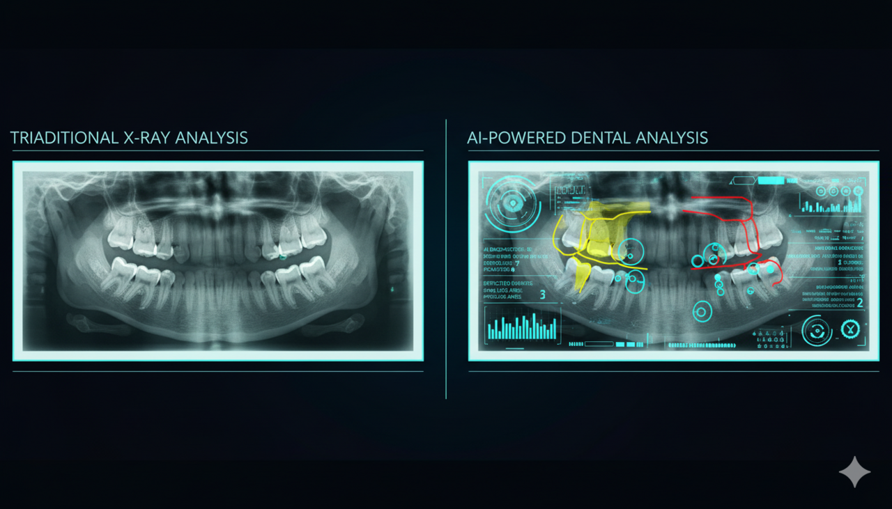 AI now reads X-rays, intra-oral photos, and CBCT scans with incredible accuracy. Platforms like Overjet and Pearl highlight cavities, bone loss, and early gum issues — sometimes before the dentist's eye catches them. Think of it as a second pair of eyes that never gets tired.