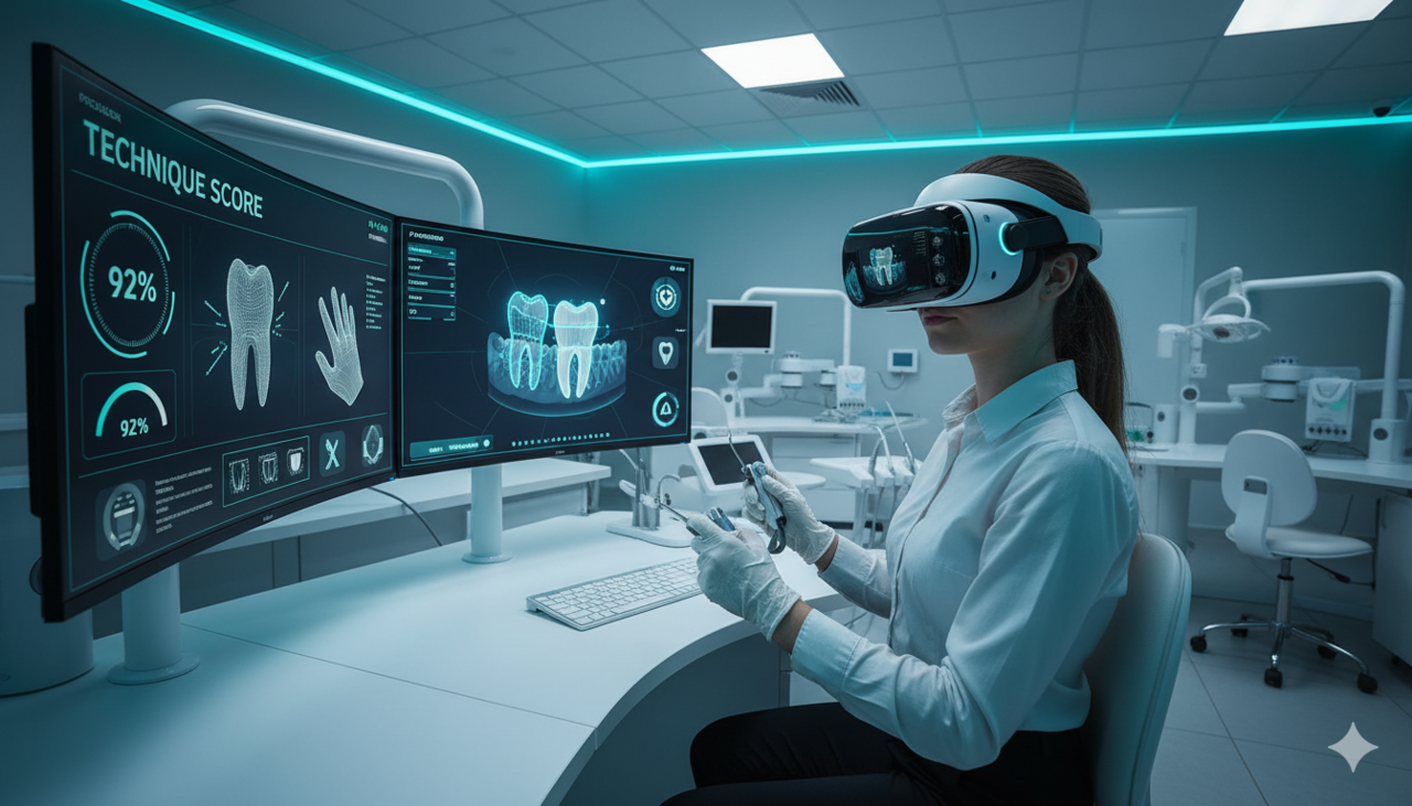 Dental schools use AI simulators and VR labs to teach procedures and grading. Students get instant feedback — where they cut too deep, where their prep angle went off. The result: faster learning and more confident clinicians.